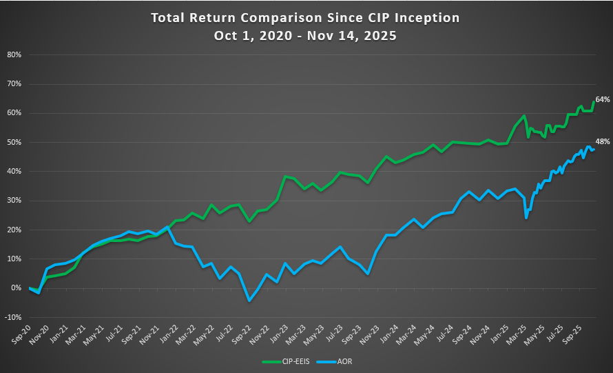 The original Enhanced Equity Income Solutions Portfolio in CIP is run on a different site (Seeking Alpha). It is benchmarked against the standard 60:40 portfolio (60% stocks, 40% bonds). We have used iShares Core 60/40 Balanced Allocation ETF (Ticker: AOR) for the performance comparison.